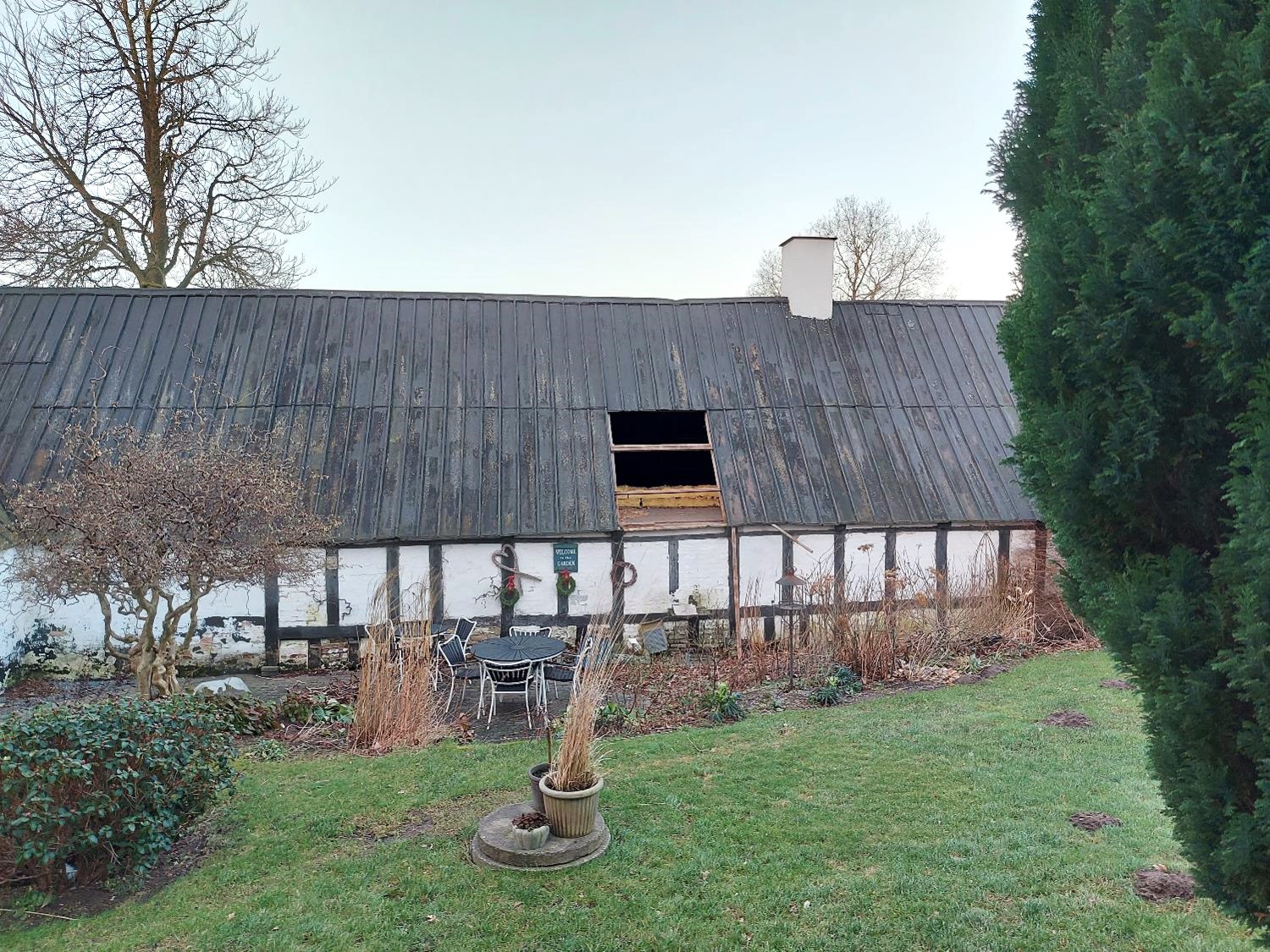 Ja, man glæder sig, når man ikke har fået noget i hverken hoved eller hus. Jeg håber tagpladen er erstattet af noget, der holder de kommende dages regn ude.