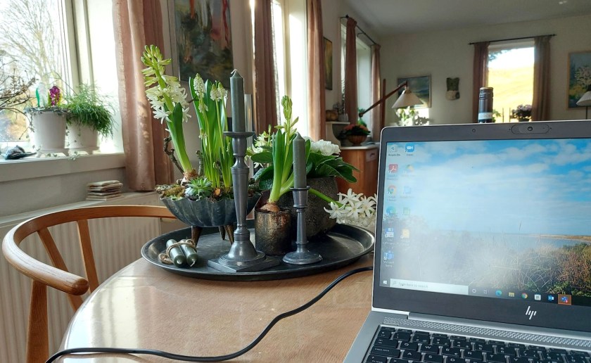 Jeg har sat mig med den bærbare ved spisebordet, så jeg kan nyde synet og duften.