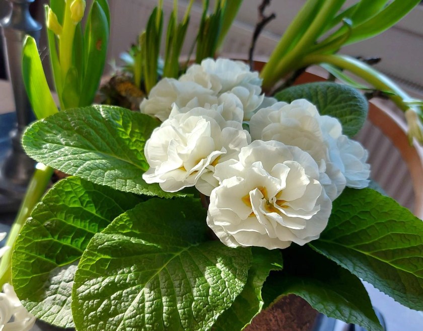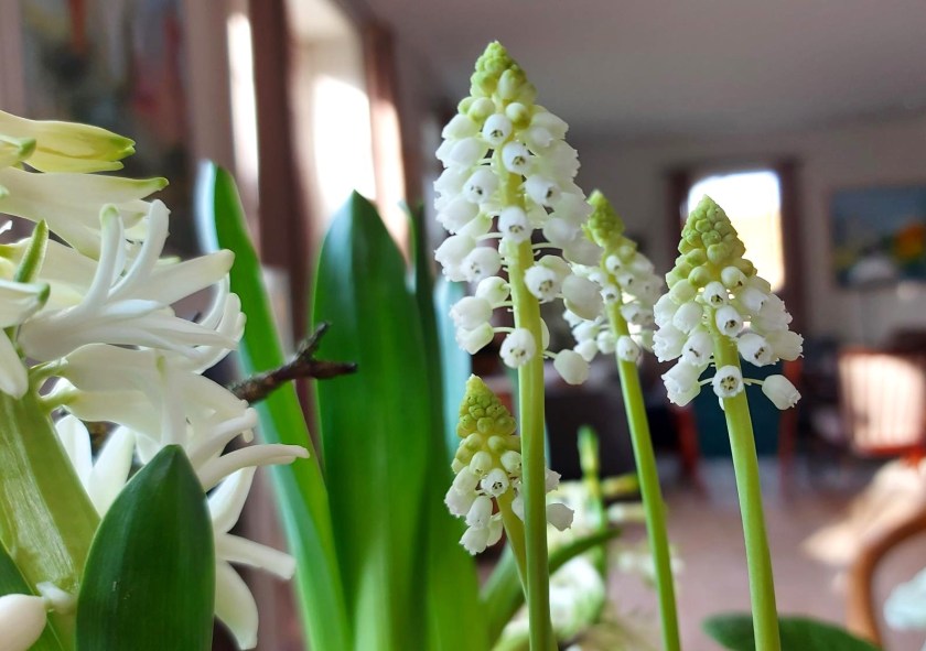 og hvide hyacinter, der nu er sprunget ud og drejer sig til alle sider. Her dufter dejligt af hyacinter.