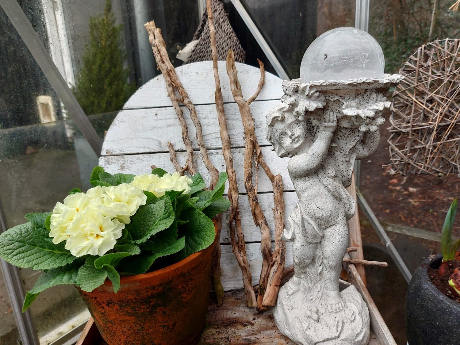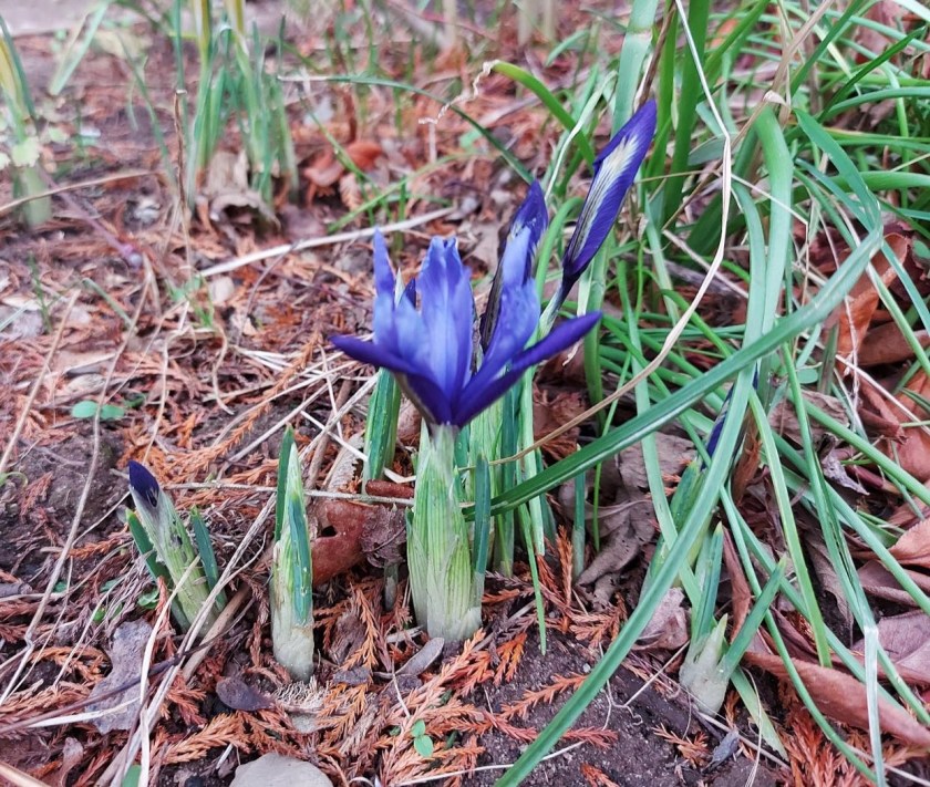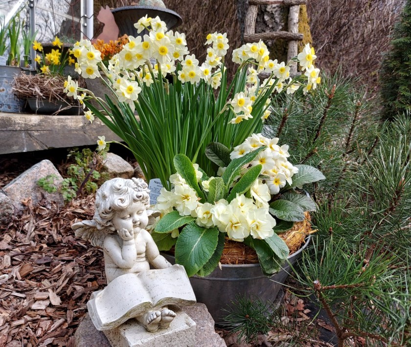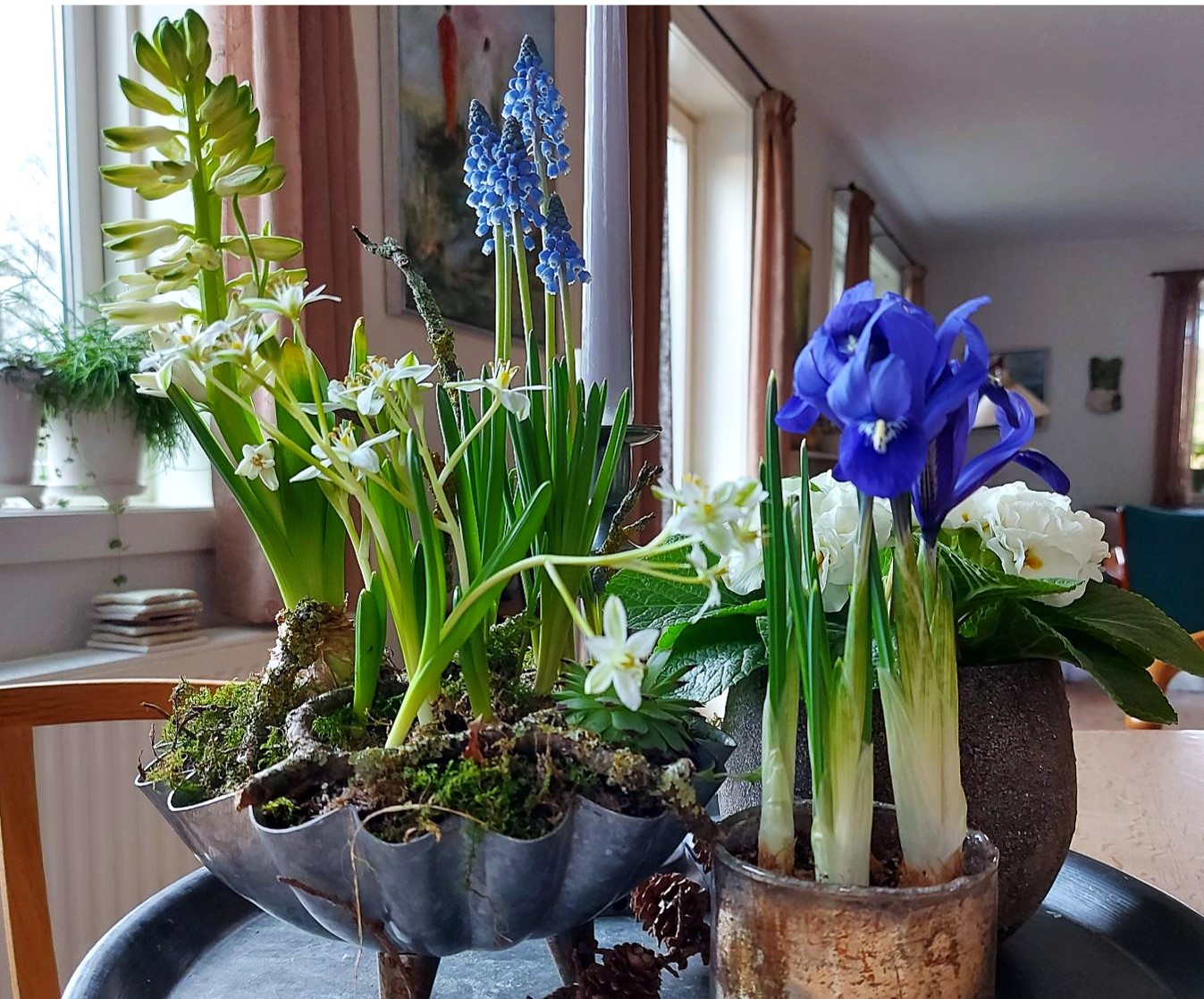 Potter med vintergækker, potter med krokus, potter med små våriris, perlehyacinter og fuglemælk.Og så har jeg slet ikke nævnt hyacinterne, tulipanerne og de små påskeliljer.