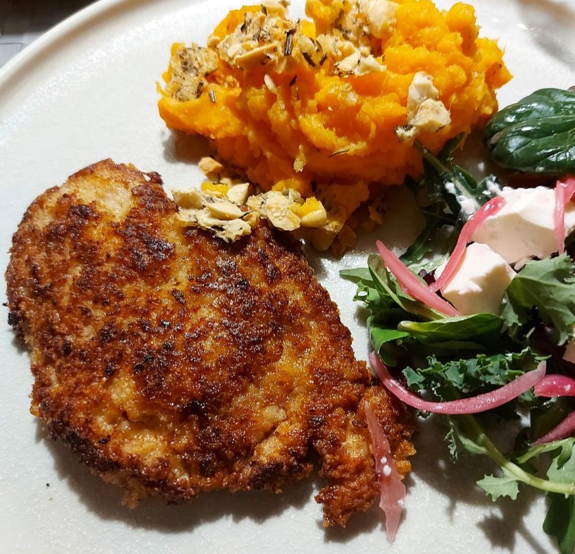 Jeg tog noget af det fra og frøs det ned (det kan man nemlig godt), og i går brugte jeg det til et par schnitzler. De blev fint sprøde hele vejen rundt.