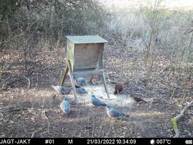 Det er ikke kun rådyrene, der mæsker sig. Vi har set grævling, to endda – og uheldigvis også en enkelt gang en mårhund. Og så er der alle fuglene. Fasaner, duer, skovskaden – det er en populær stamcafé for mange.