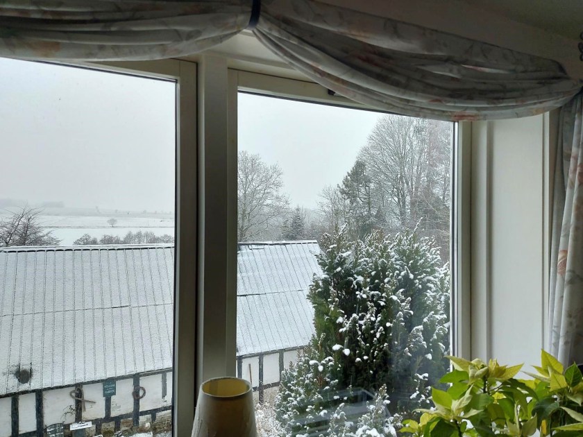 I morges vågnede vi til et hvidt landskab. Den regn, der var forudsagt til i dag, var med klumper i. Snevejr. Våd, kold, lige omkring frysepunktet-tøsne.