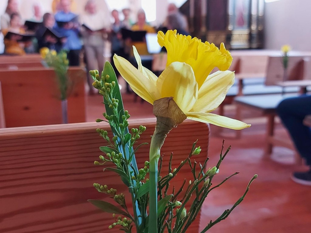 I går til påskegudstjenesten i Skivholme kirke var der også smukt pyntet med påskeliljer, og solen strømmede ind ad ruderne. Jeg tog lidt billeder til hjemmesiden, men nød ellers bare at være med og være til.