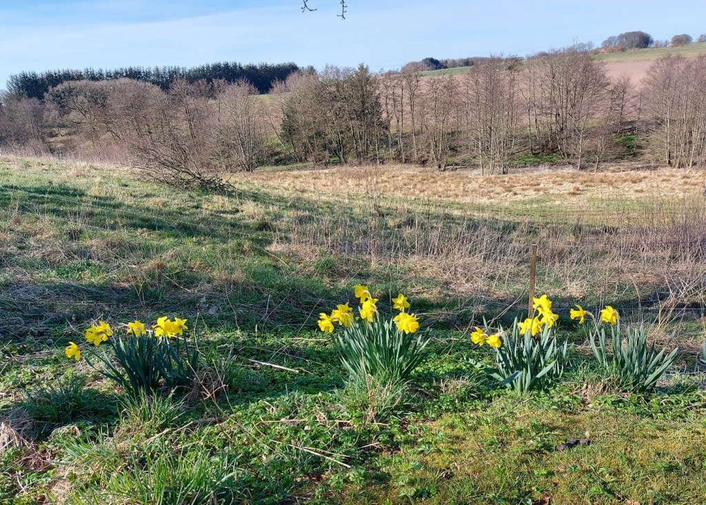 Og for en gangs skyld passede påsken lige med, at påskeliljerne står i fuldt flor. Pænt plantet i haver og vildt på skrænter og grøftekanter, hvor en entreprenant fugl engang har tabt et frø.