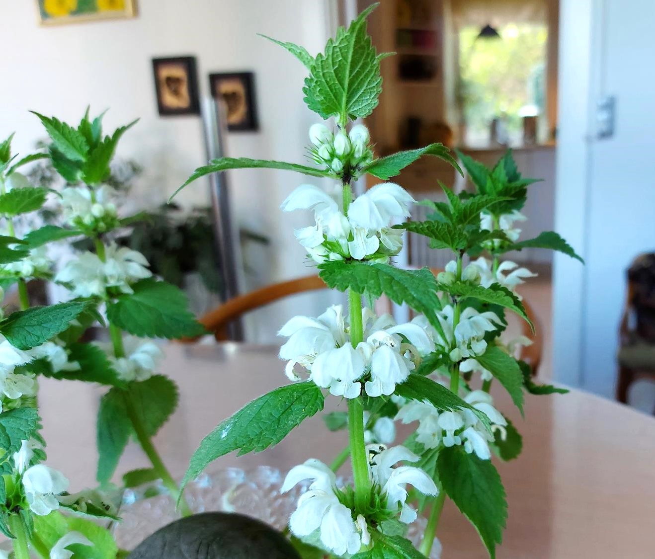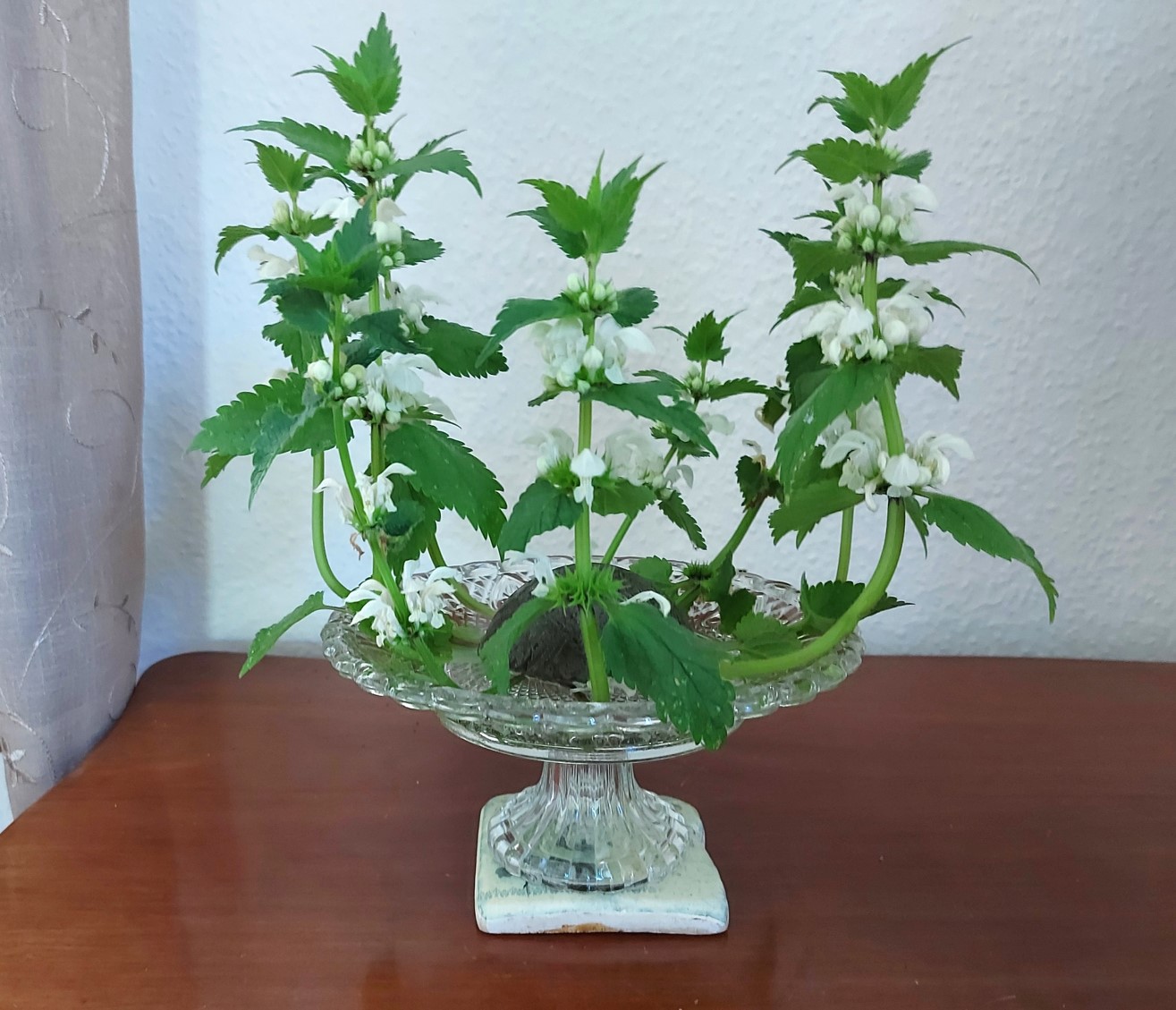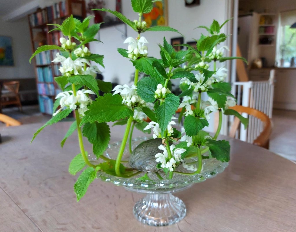Gå ud og pluk en håndfuld døvnælder. Det er dem, der blomstrer med hvide blomster. De ligner brændenælder, så hold øje og pluk ikke nogen uden blomster. Brændenælderne blomstrer først senere.