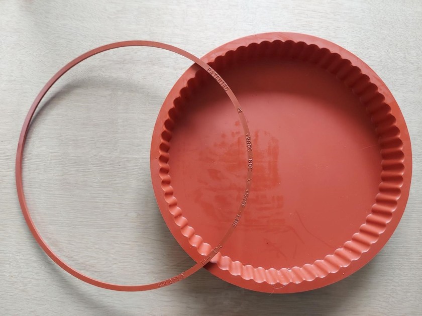Fordel dejen i en 23 cm springform (eller en silikoneform som den på billedet). Læg rabarberstykkerne ovenpå og drys med 1 spsk sukker.