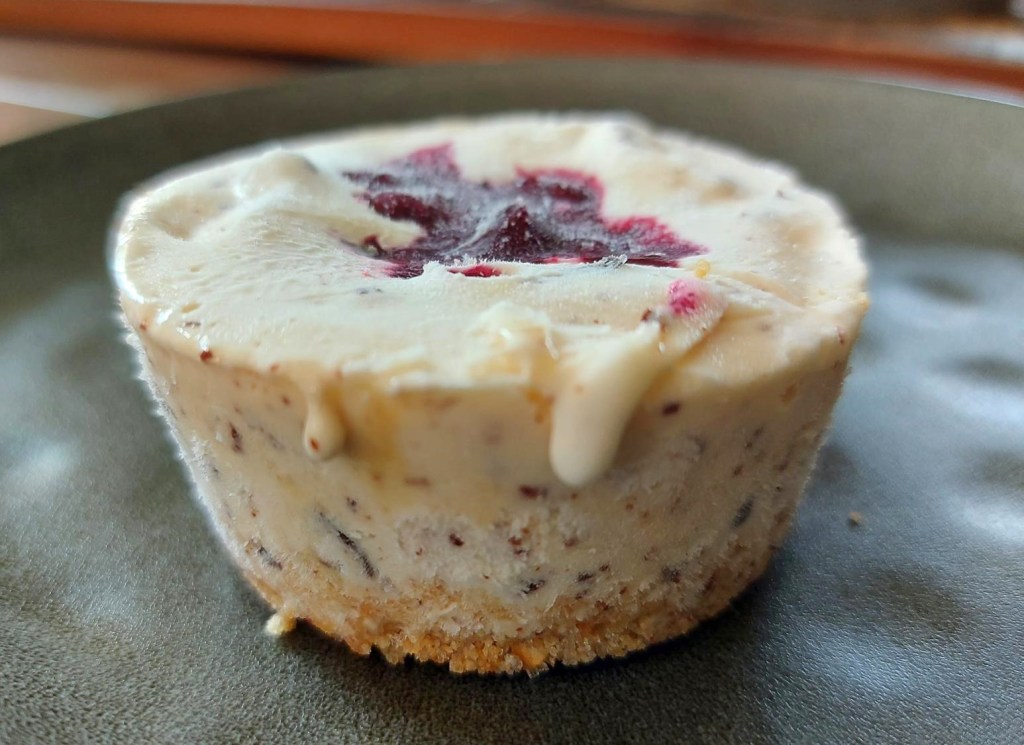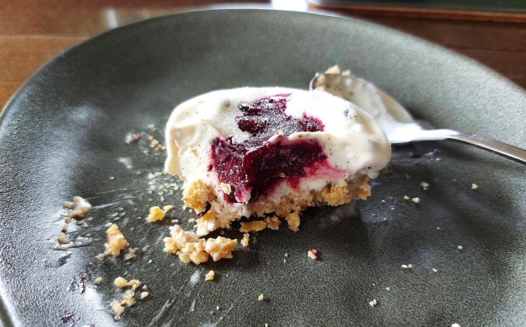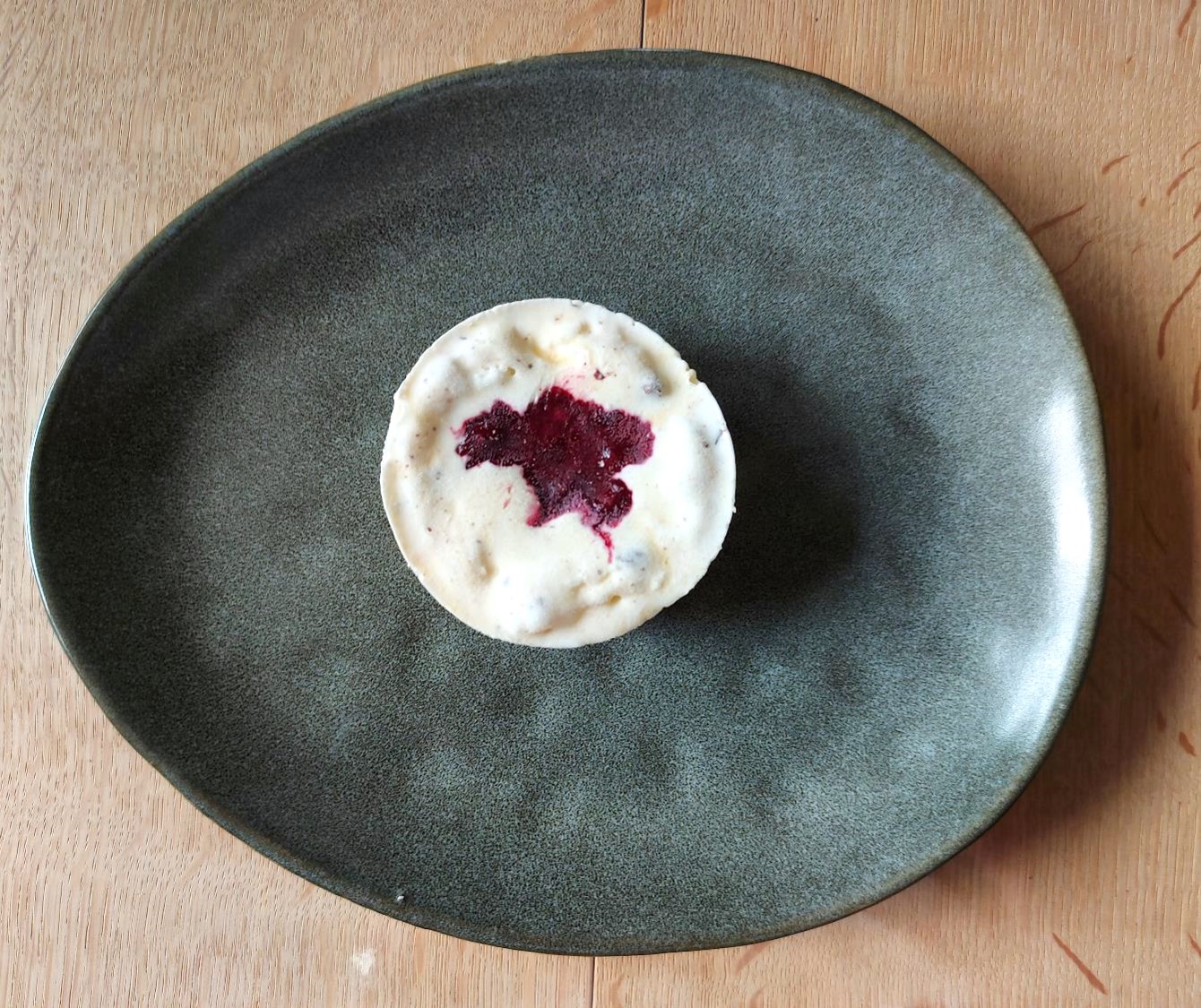 En sprød bund lavet som bunden af en cheesecake (bare af knuste isvafler), med fyld af vanilleis rørt med hakket chokolade og karamel og pyntet med en klat solbærsyltetøj.