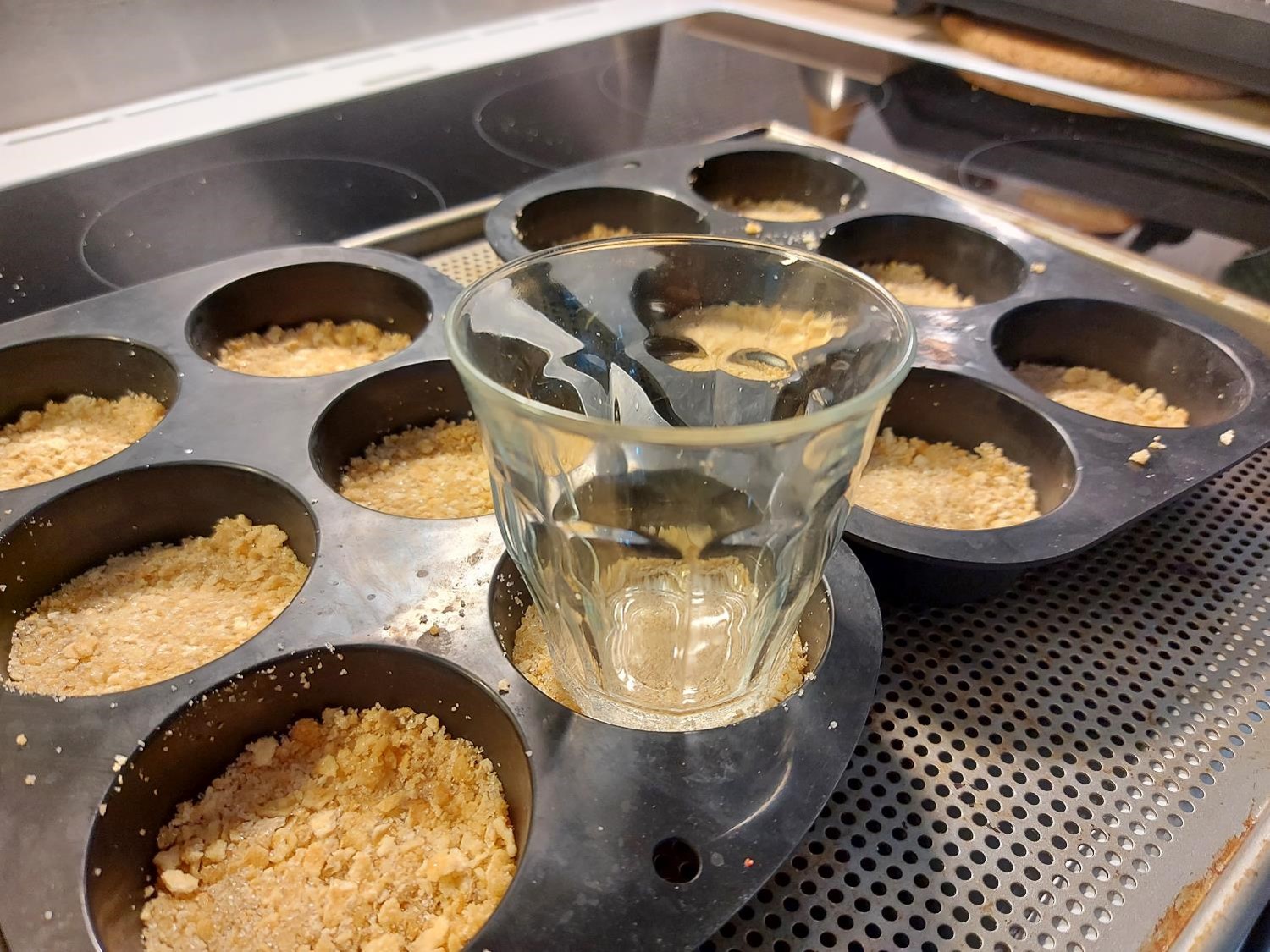 Fordel krummerne i muffinformen. Brug bunden af et glas til at ‘stampe’ dem med. De skal presses godt sammen.