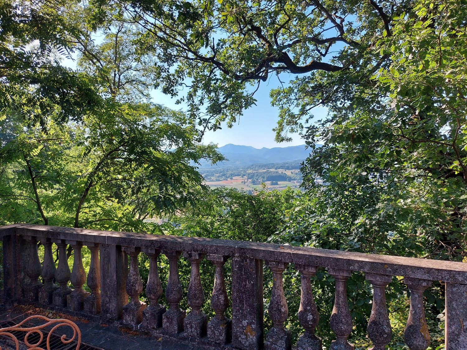 Omkring slottet, omkranset af mure til bysiden og af en stenbalustrade ud mod udsigten,