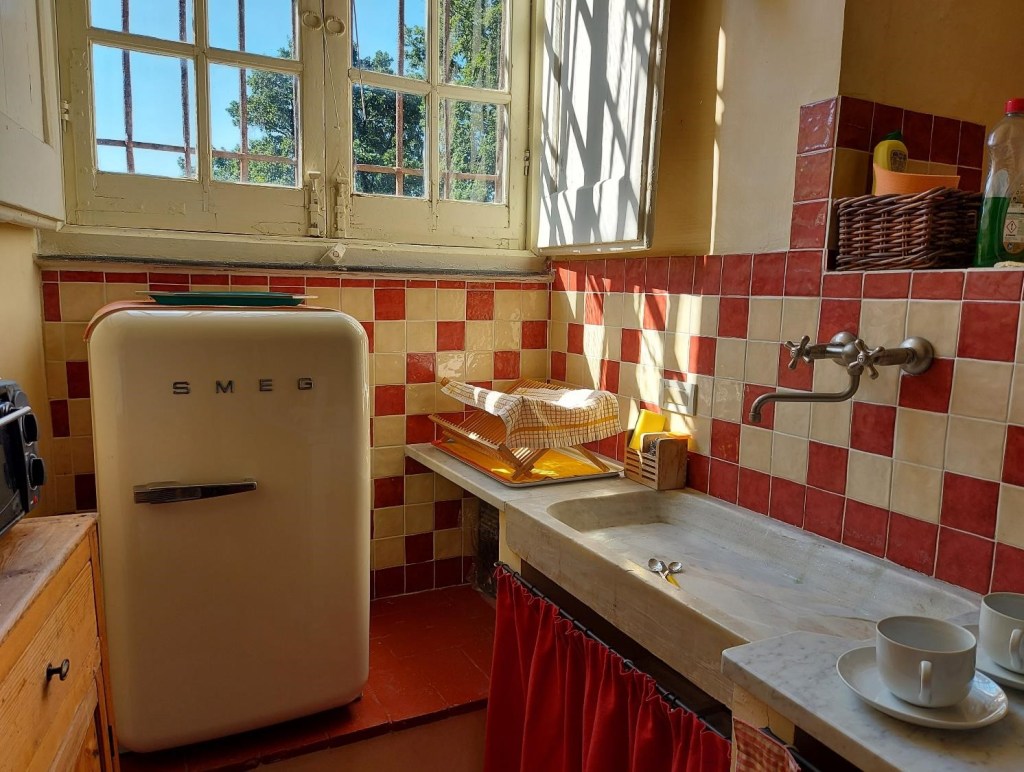 Lejligheden var indrettet med antikviteter og Ikeamøbler i en skøn, uformel stil, og det lille køkken med den store marmorvask og det gamle SMEG køleskab var både kønt og funktionelt.