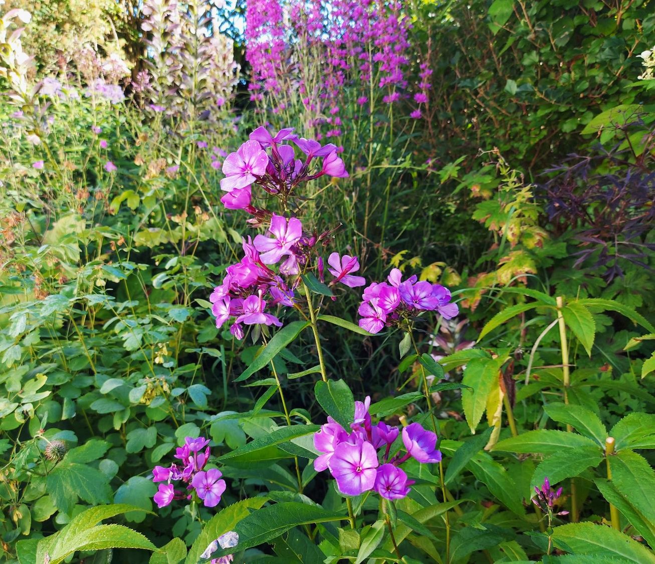 Dug på blade og græsser om morgenen, brændende sol – i hvert fald i disse dage – om eftermiddagen. Der skal vandes, men på trods af tørken, der har gjort floksens blomster lidt mindre end normalt, ser det hele forrygende ud.