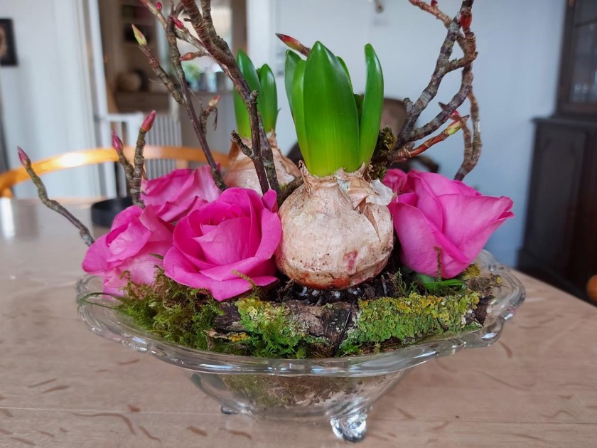 Den lille deko her lavede jeg i går aftes. Den er lavet i oasis, og hvis du har lyst til at prøve dig frem med sådan en, får du en vejledning herunder. Det er nemlig ikke særlig svært, men resultatet er rigtig sødt, og du kan bruge det, du nu engang har eller kan finde.