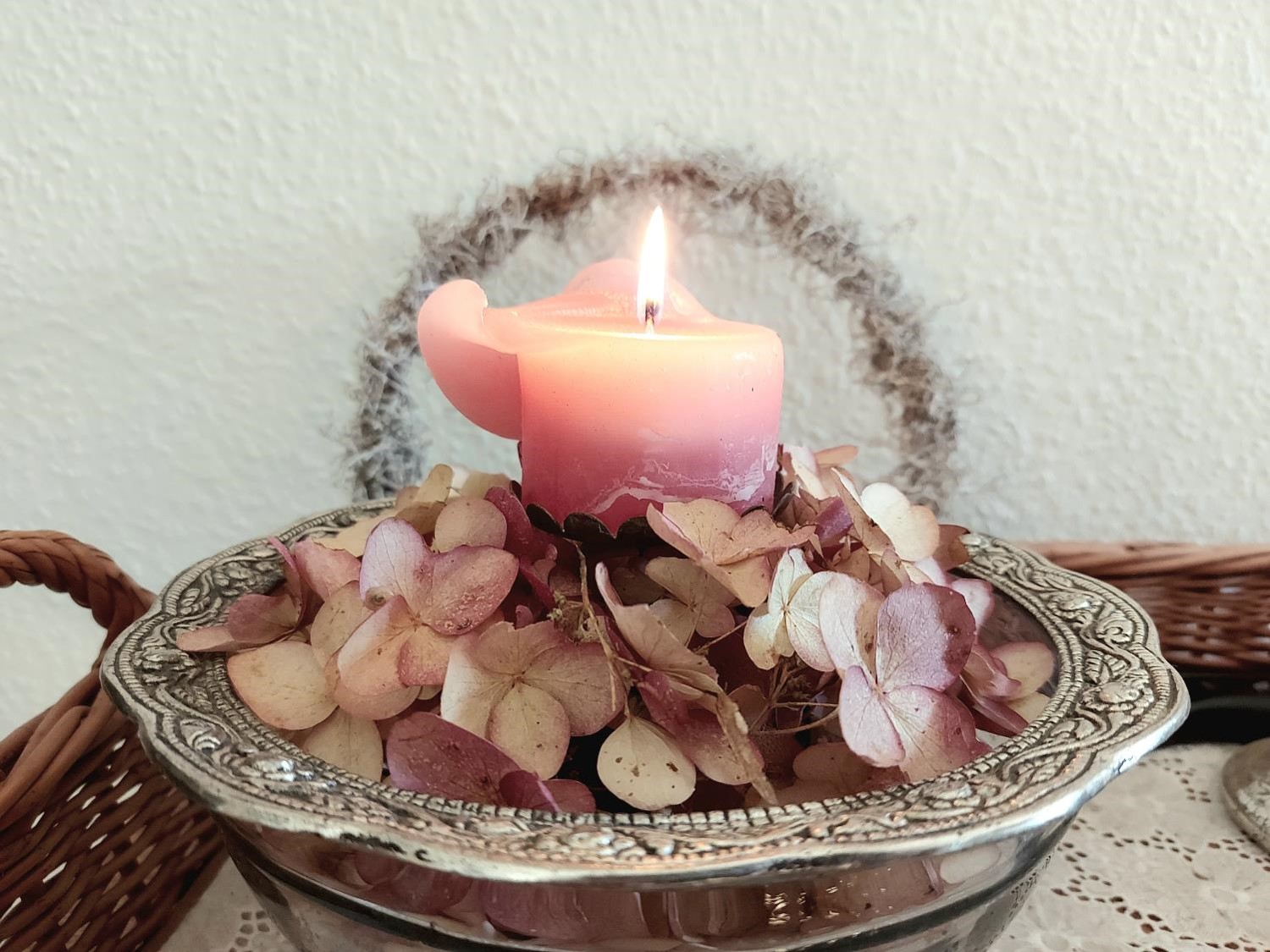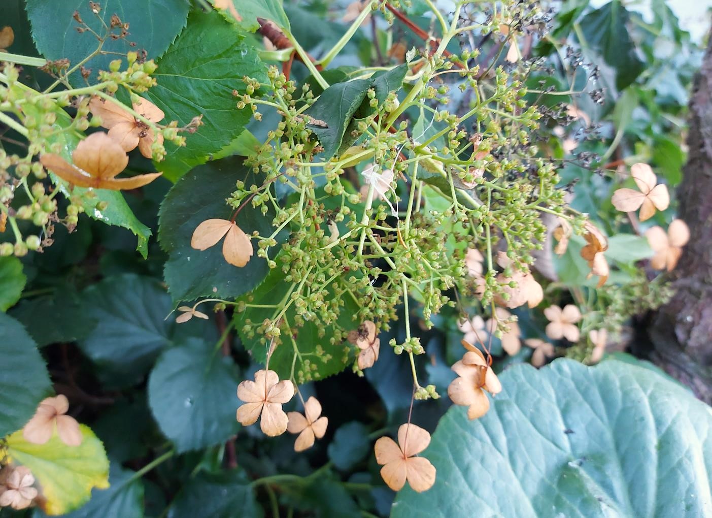 Vi har nydt dem i måneder, men nu går de ind i deres sidste fase for i år. De kridhvide syrenhortensia toner over i rosa nuancer og derefter til brunt. Når de begynder at falme, bliver blomsterne mere læderagtige, og så er det, man kan tage dem ind til tørring.