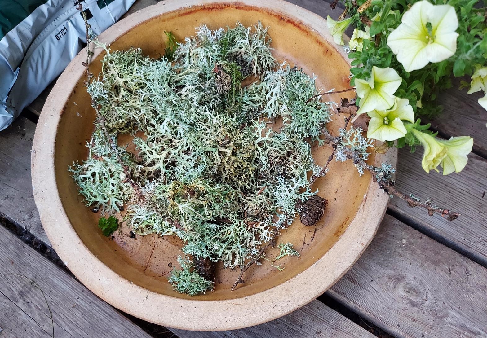 - Lav og mos skal opbevares fugtigt udenfor. Jeg har mit lager i drivhuset, hvor jeg også har gran og andet stedsegrønt.