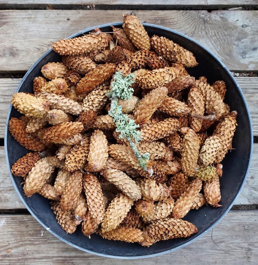 På vores ferie på Mors samlede jeg flere poser skøn naturpynt. Kogler fra de mange grantræer, der er plantet for at give læ for vestenvinden, fyrrekogler med patina fra den saltholdige luft, grene med lav og stykker af bark fra Sitka graner, der gavmildt drysser barkstykker omkring sig.