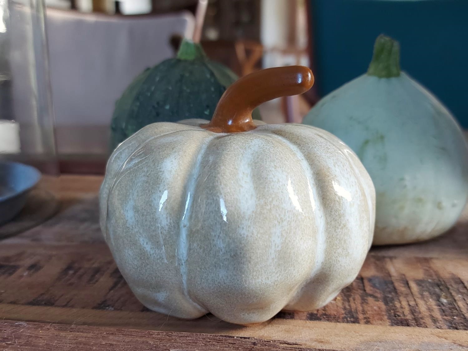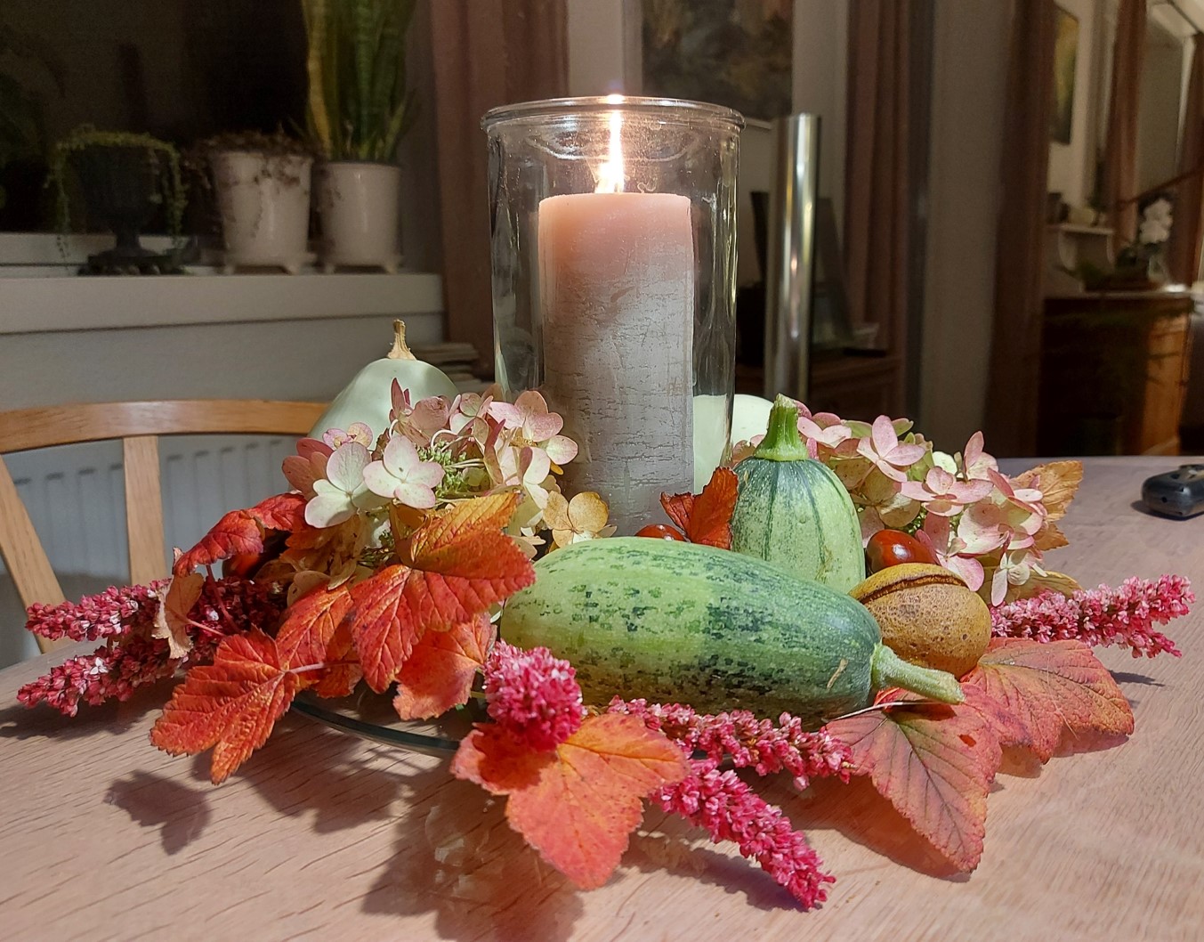 Endnu en praktisk taget gratis dekoration, der pynter så fint på den ‘antikke’ træbakke sammen med lys i glas, lidt ægte pyntegræskar og et rigtig langtidsholdbart græskar i keramik, jeg købte i Flensburg i sidste uge.