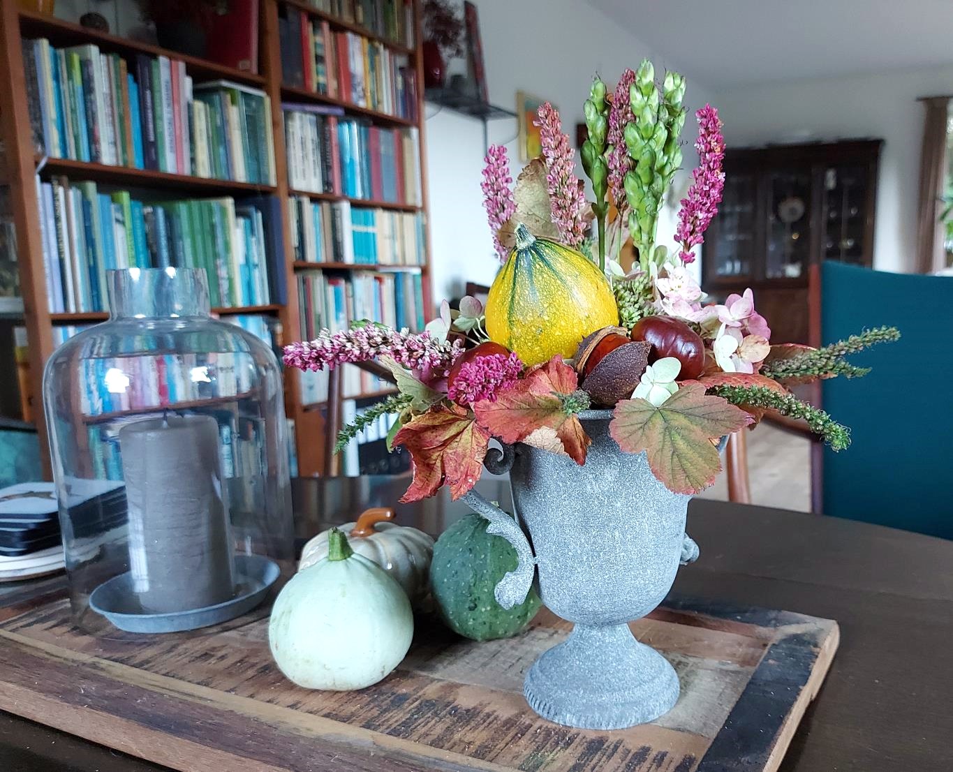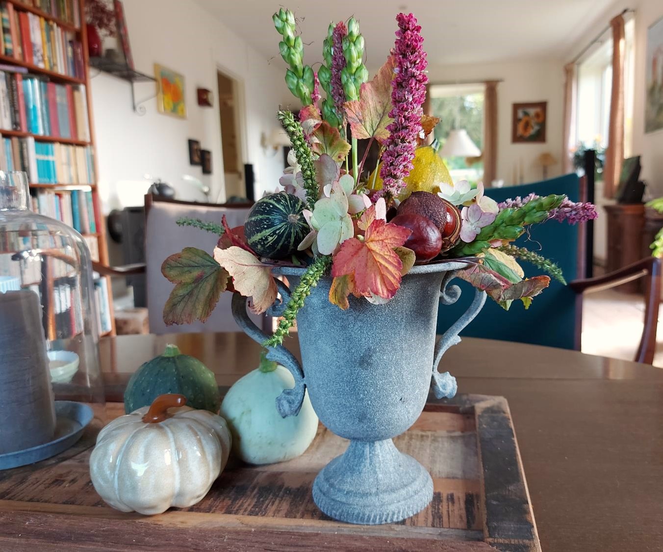 Sidste år til min fødselsdag fik jeg en grå pokal, som jeg har brugt til dekorationer lige siden. I vinter, i foråret, i sommer og nu igen i efteråret.