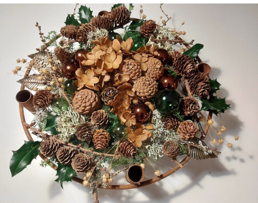 Materialerne er brune hortensia plukket samme dag, så de var bløde og medgørlige, lavgrene og lav fra lærketræerne på Mors, lærkekogler, fyrrekogler med bunden i vejret, glaskugler i brunt og klart, grønt glas, kristtorn og et par kobberblade fra pyntekassen. De fine, lette frøstande er hør fra vildtstriben.