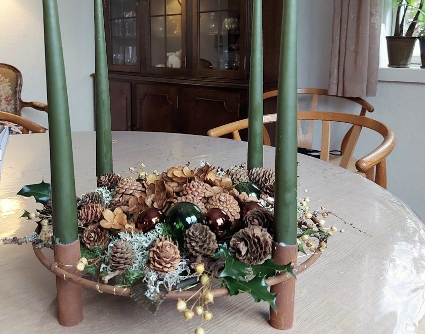 Nu er det jo sådan, at en adventskrans med tynde lys ikke brænder så mange timer som en med bloklys. Derfor er næste projekt en adventsdekoration til sofabordet med bloklys, der kan brænde hele adventstiden. Det kommer der mere om, når jeg er færdig med den.