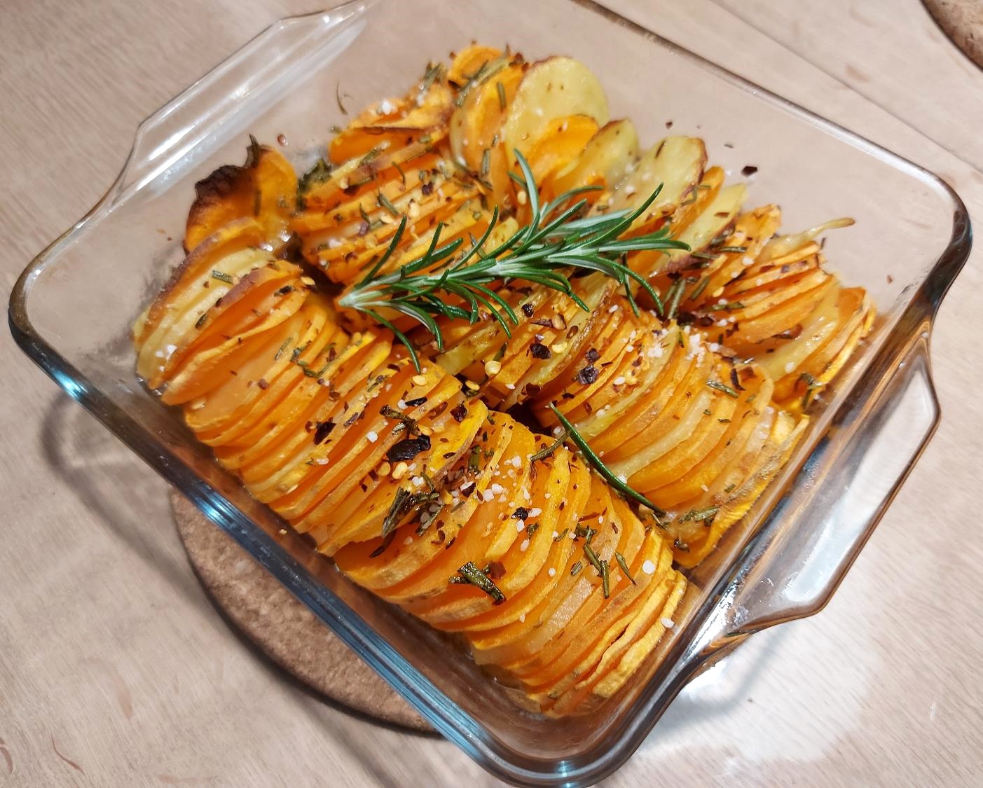 Skræl kartoflerne og skær dem i tynde skiver. En til to millimeter tykke. Smør et lille ovnfast fad med smeltet smør. Sæt skiverne på højkant i fadet – først de søde kartofler og derefter stikkes de almindelige kartofler jævnt fordelt ind mellem dem. Smør overfladen med resten af det smeltede smør. Brug en bagepensel, det er det nemmeste. Drys med hakket rosmarin, salt og peber.