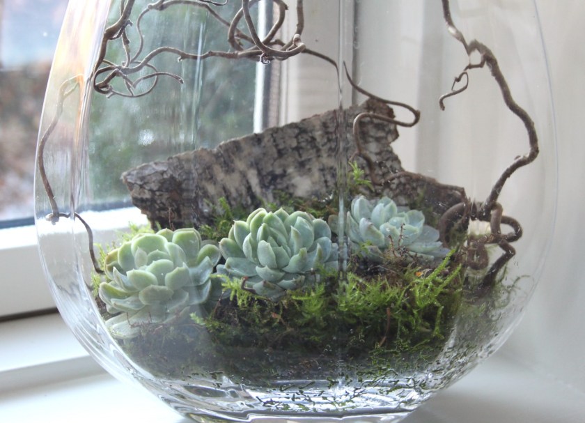 Både husløg og echeveria kan overvintre. Echeveria skal holdes inde vinteren over, mens husløgene kan sættes ud, når dekorationerne er færdige. Sidste år holdt jeg liv i mine echeveria ved først at have dem inde – nogle af dem i den store glasvase.