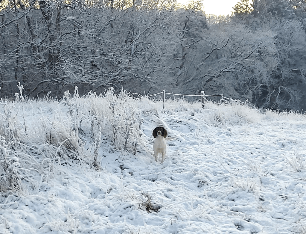 For da solen gik ned der lidt i fire, gik vi en solnedgangstur. Det er svært at slippe en dag, så smuk som den i går. Solens sidste lys farvede horisonten, mens mosekonens arktiske veninde bryggede rimtåge over markerne.