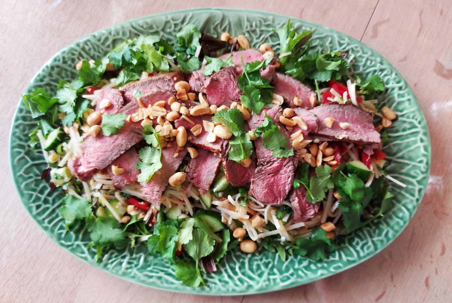 Asiatisk Beef Salad med nudler, krydret dressing og ristede peanuts