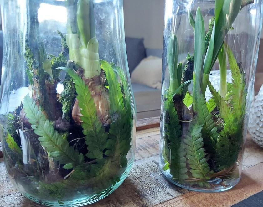 Det er dejligt at få lidt forår ind i stuen 🍀🍀🍀. Det ser godt ud i de høje glas Karin 🌿. Jeg kan se i min have at vintergækker og erantis er kommet op 🌼🌱. God weekend til dig 🌞