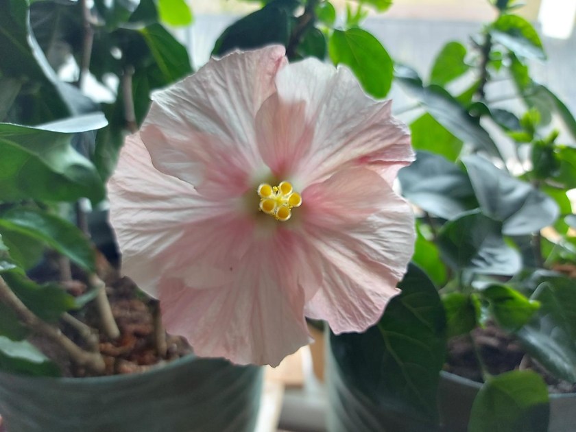Men nu her midt i marts, er der liv igen. De har fået lidt gødning, der kommer lys ind ad vinduerne, og straks kvitterer de med skud og knopper – og i dag med den første blomst. I den yndige, lyserøde hibiscus, den uden den dramatiske mørke midte. Den er sådan en lille prinsesse at se til.