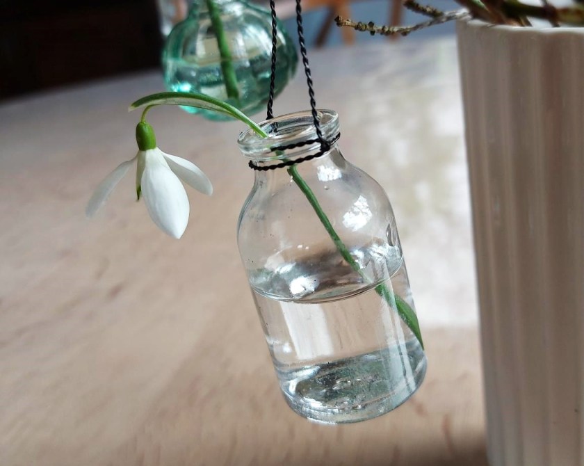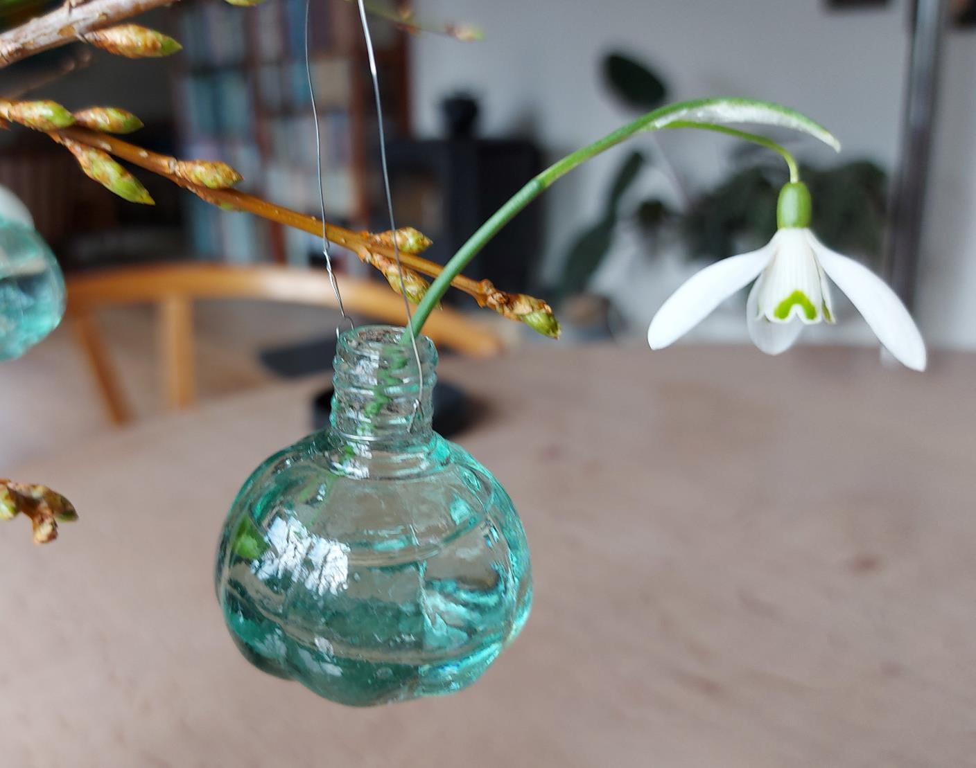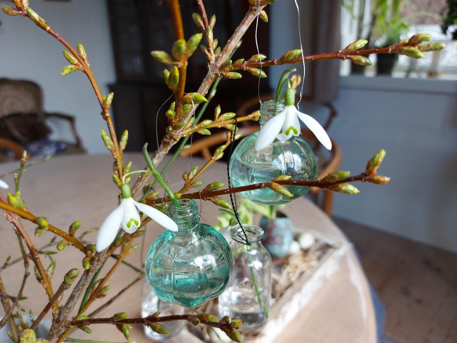 I sidste uge fik jeg en dejlig værtindegave. 10 små vaser, der kan hænge på en gren og fyldes med blot en enkelt, lille forårsblomst. Jeg har plukket 10 vintergækker, sat dem i vaserne og hængt dem på et bundt grene derudefra. Forsythiagrenene vil snart springe ud, og så bliver det endnu finere med de små vaser, der kigger ud gennem det gule.