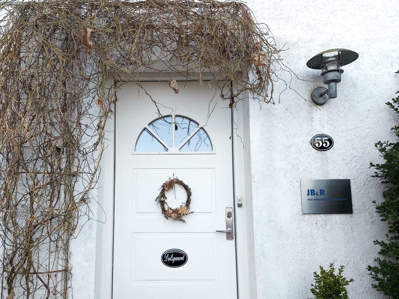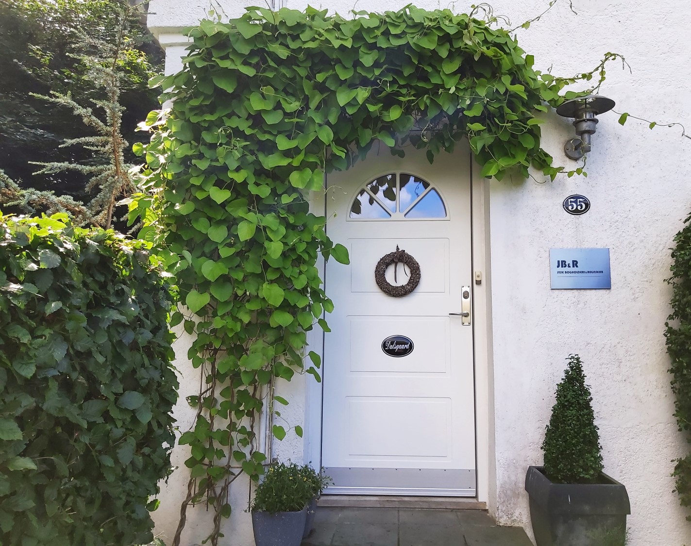 En dør som vores kalder næsten på en krans. Lige nu ser det lidt trist ud med de bare stængler på tobakspibeplanten.