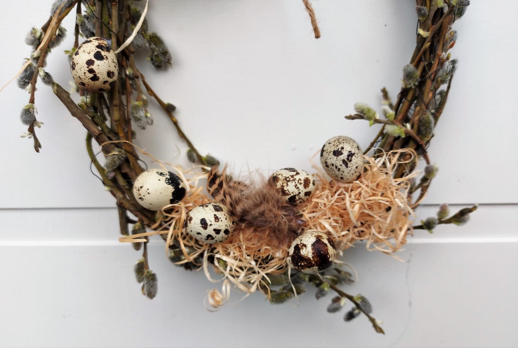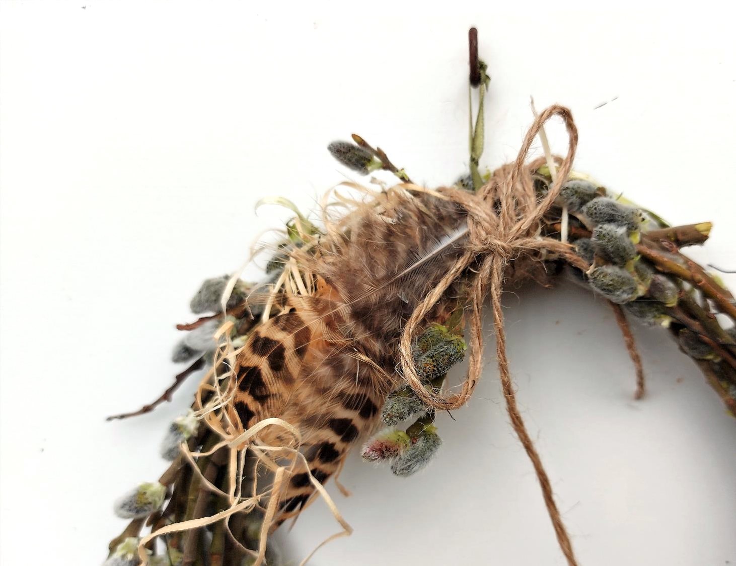 Kransen er bundet med vindseltråd, trukket i facon og pyntet med træuld, vagtelæg og fjer.