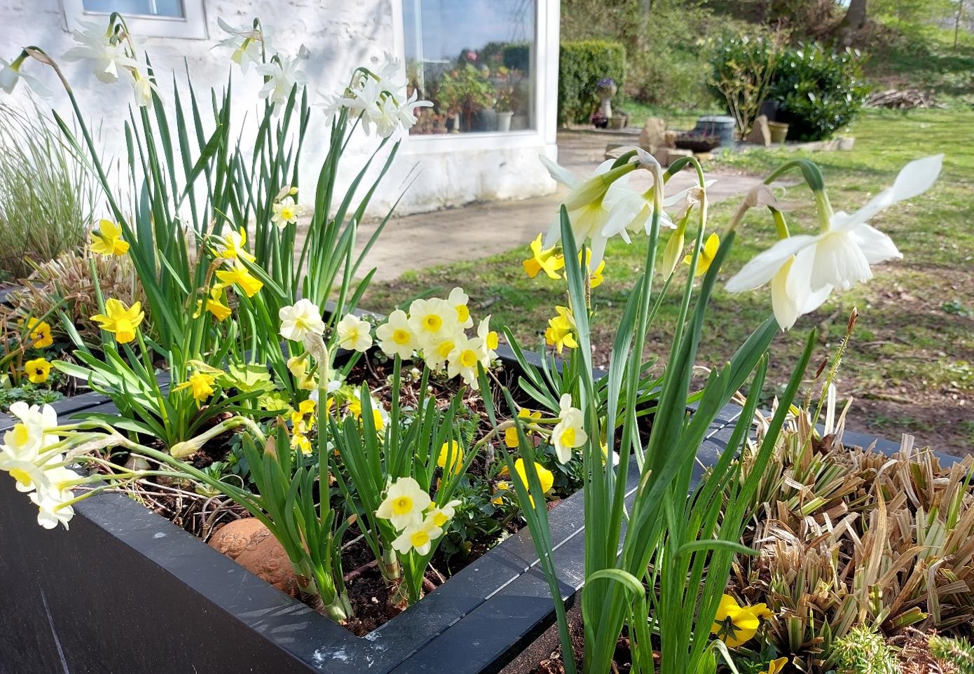 Den smukke, hvide narcis, Thalia, er også sprunget ud sammen med de bittesmå narcisser, der hedder Minnow. Det er en fest.