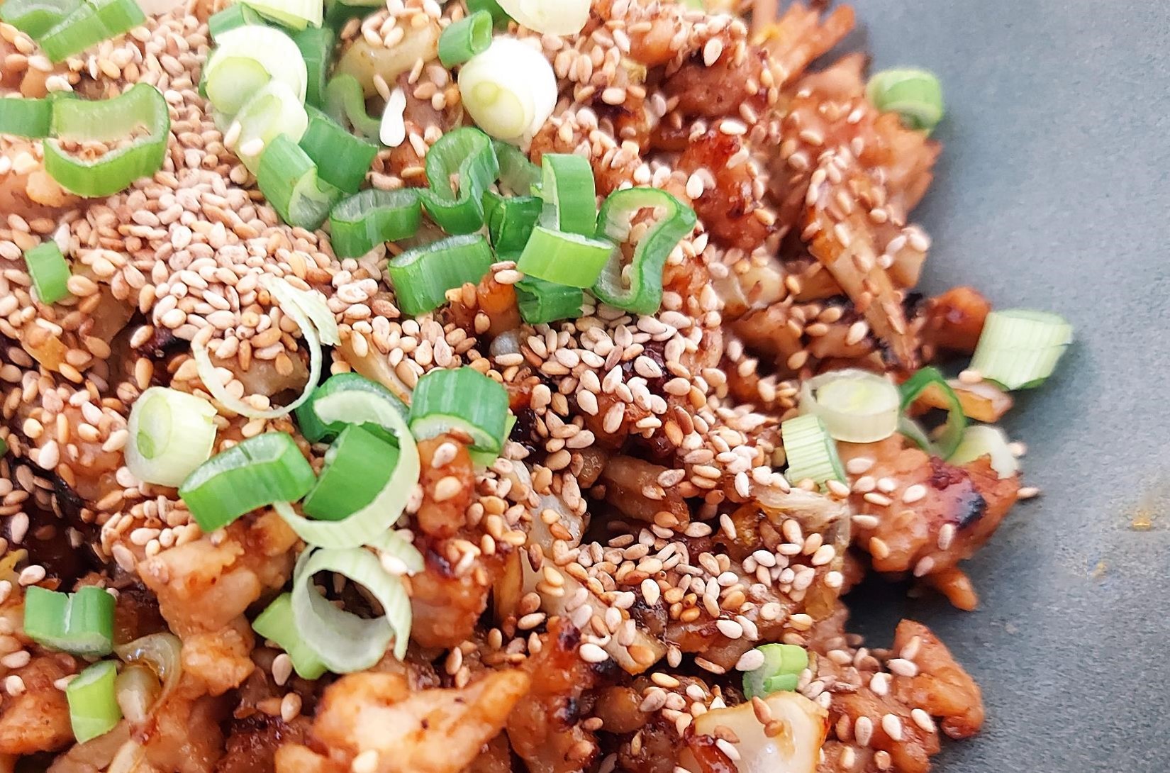 Hakket kyllingekød, chiliolie og en spicy krydderiblanding, tilsat tyndtskåret spidskål og næsten sprødstegt. Det er opskriften på den kyllingeret, vi lavede i går.