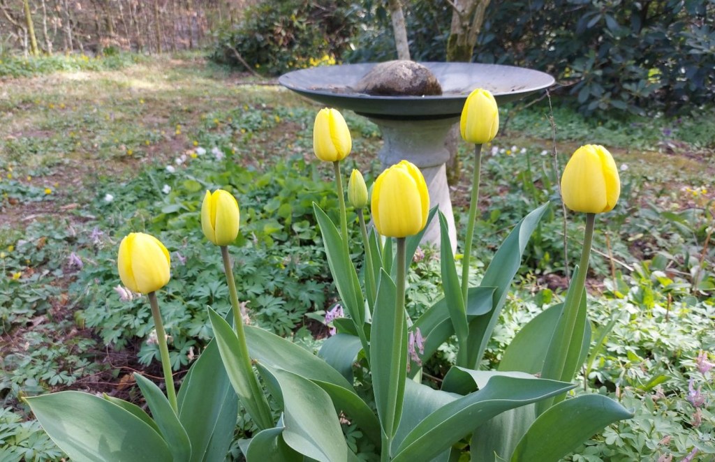 En glædelig overraskelse er kommet i skovhaven. Sidste år købte jeg nogle tulipaner i en potte til at bruge i en påskedekoration.