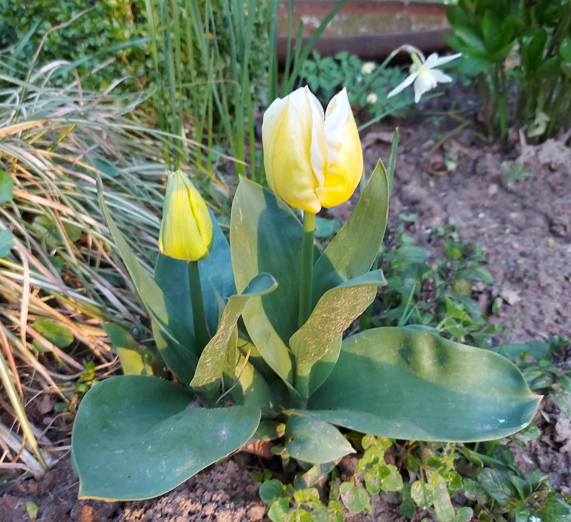 En glædelig overraskelse er kommet i skovhaven. Sidste år købte jeg nogle tulipaner i en potte til at bruge i en påskedekoration.