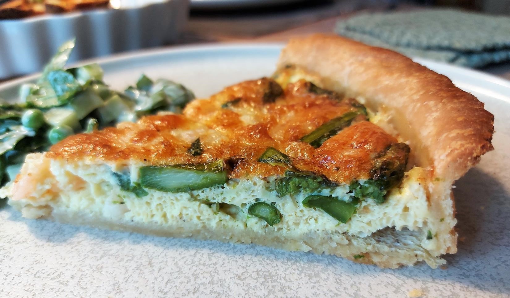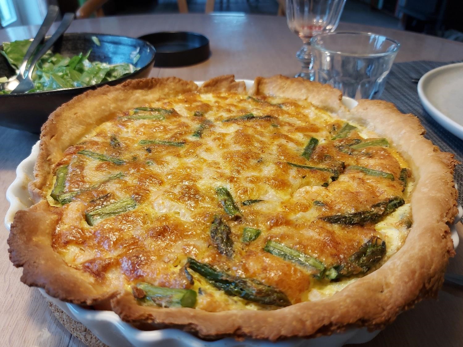 Man kunne få den ide, at vi slet ikke laver mad herhjemme længere. Det er ikke helt rigtigt. Det bliver bare mest til gamle kendinge. Energien bliver lagt i hvalpene og i haven lige nu. I går lavede jeg dog en tærte med rejer og asparges fra haven, og den er faktisk værd at skrive om.