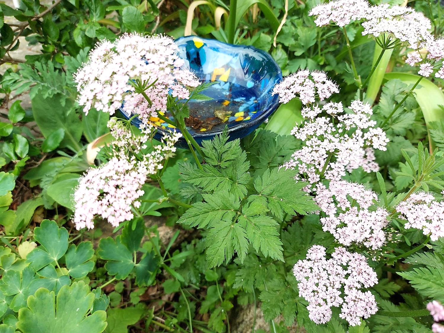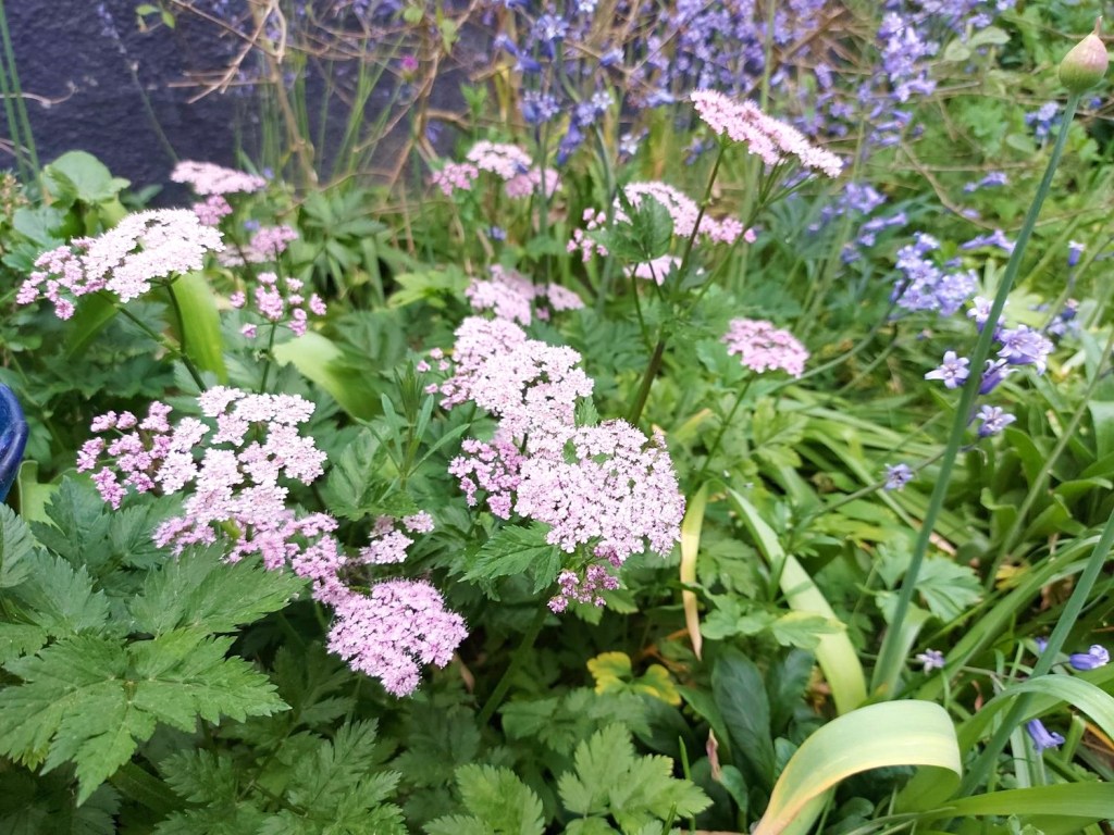 Den rosa bjerghulsvøb, Chaerophyllum hirsutum var. roseum, fandt jeg til plantesalg hos Staudeblomsten for et par år siden. Den var mærket som ‘Kirstens yndlingsblomst’, og den er virkelig også meget smuk. (Hvis du ikke kender Staudeblomsten, kan du læse mere her og her. Staudeblomsten ligger ved Hørslev kun få minutter herfra, og jeg besøger dem så tit, det kan lade sig gøre.)
