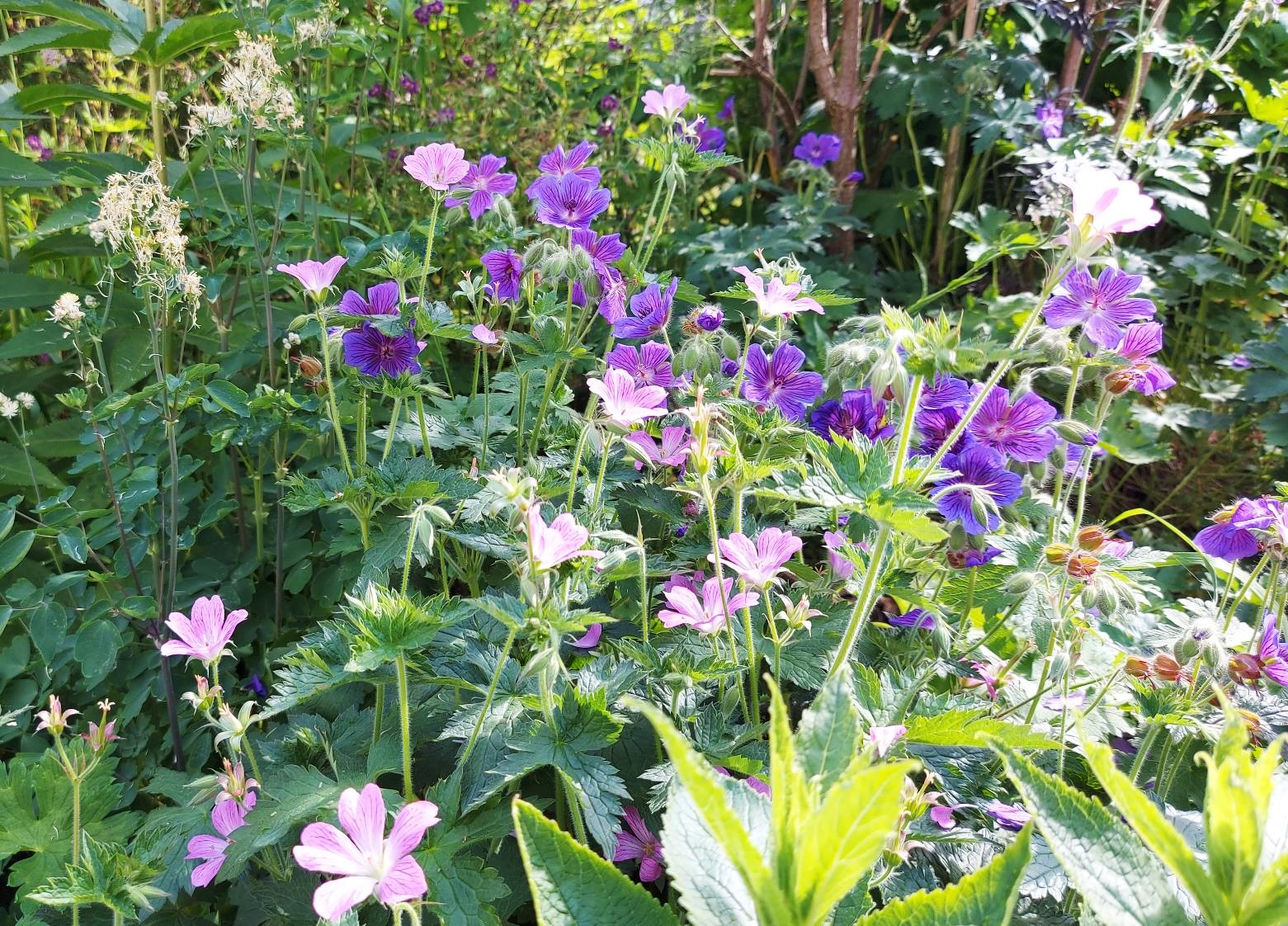Akelejerne er ved at være færdige, og det samme gælder de to langsomtvoksende rododendron. De fik ikke mange chancer i det tørre og solrige vejr.