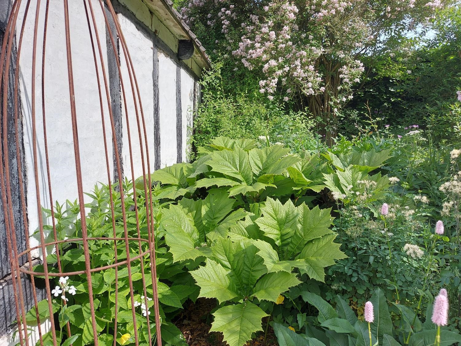 Aldrig er haven inde mellem bygningerne – blomsterhaven – dejligere end nu her i juni. På trods af tørken står det meste fint, og blomster vælter op og ud fra bedene.