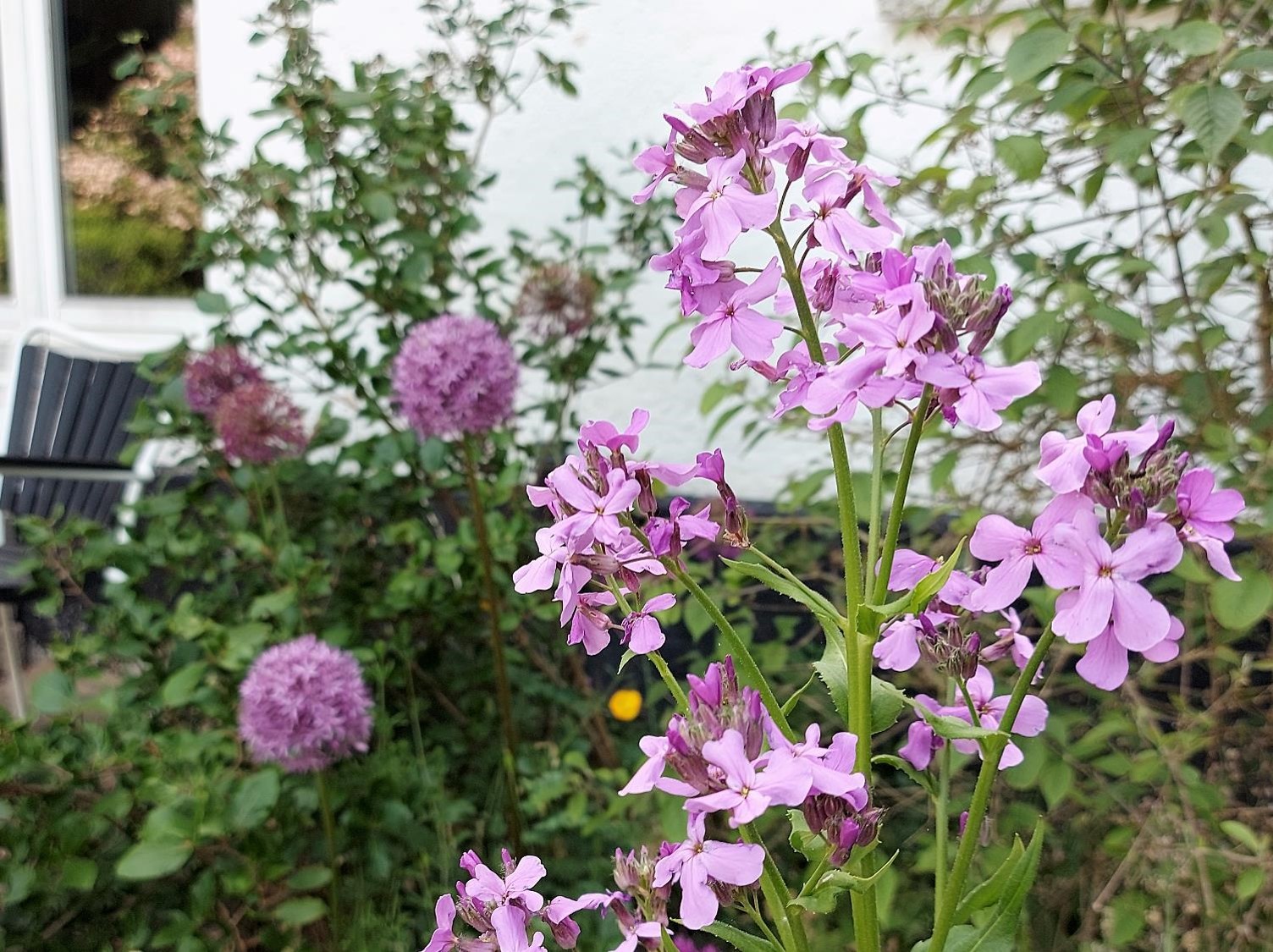Duft fra minisyrenen, der stadig holder ved, og fra de mange vellugtende aftenstjerne, der sår sig selv rundt omkring.