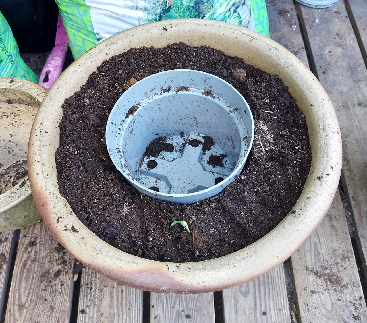 Nu kan krukken bæres på plads, og man kan vande grundigt. (En stor krukke er lettere at bære, før man vander.)