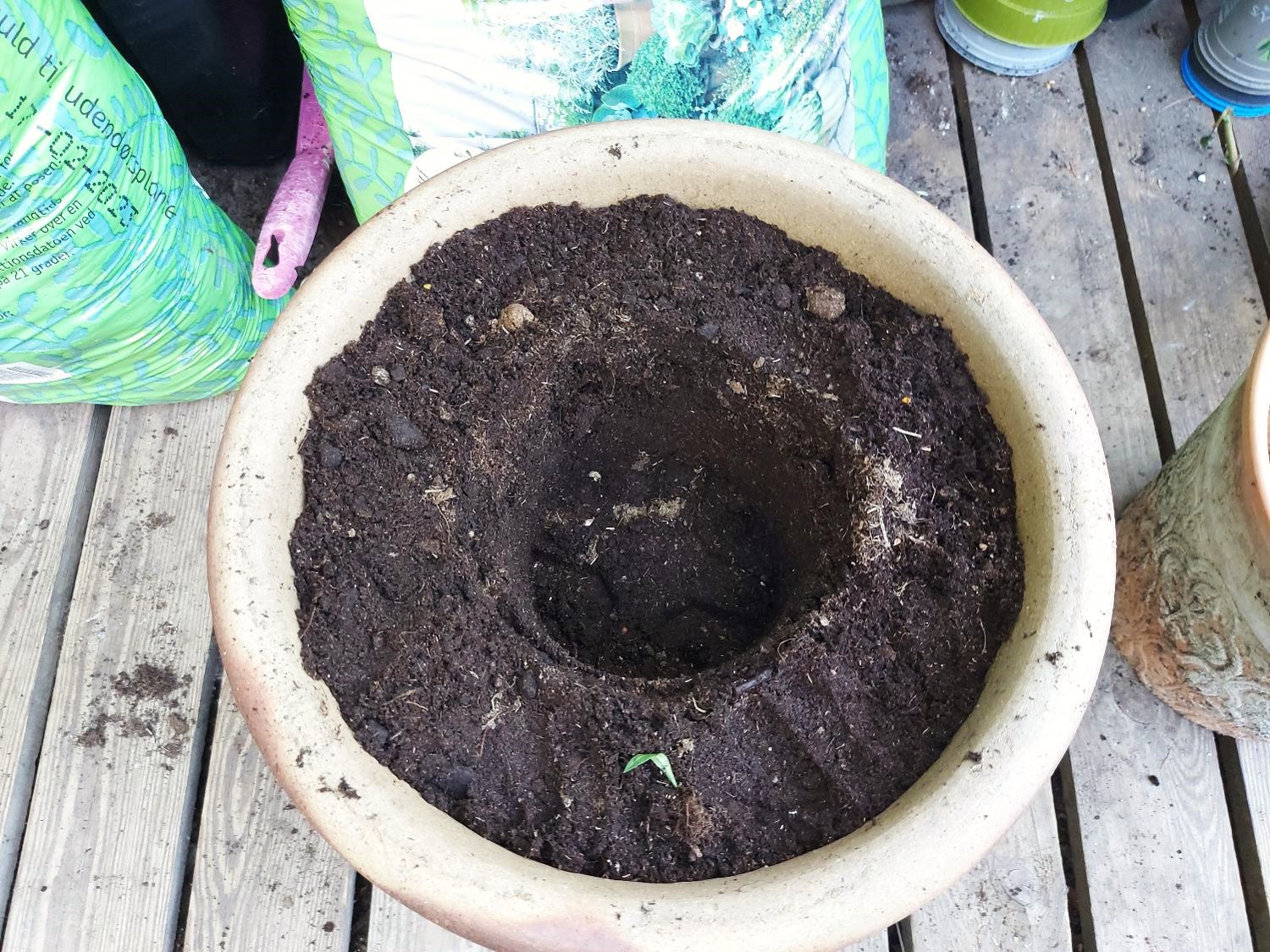 De har det meget bedre i en større krukke, man kan vande tilstrækkeligt. Men når man skal plante i krukkerne, er det altid lidt bøvlet at få jorden pakket godt nok op om rodklumpen. Især er det svært med flade og brede planter. Det har jeg fundet en løsning på, og den vil jeg gerne dele – hvis altså ikke, det er mig, der igen er en last mover, og alle I andre har gjort det sådan i årevis?