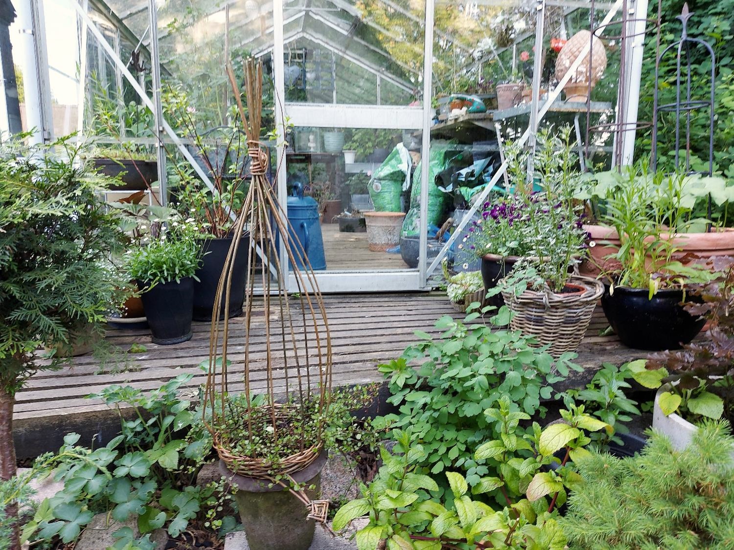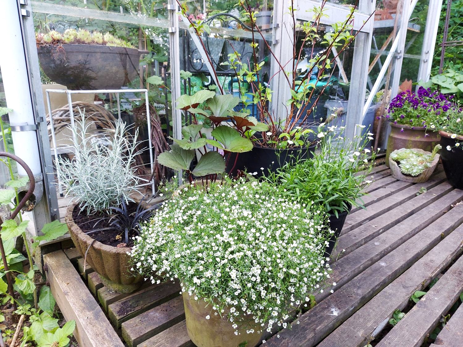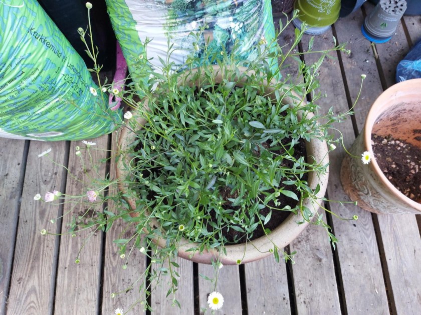Krukkerne står i lag hos os. Krukker med sommerblomster, krukker med nye stauder, krukker med grøntsager og krukker med indeblomster, der er på sommerferie ude. Jeg går og arrangerer og flytter omkring på dem, så det hele kan se pænt og frodigt ud uden at blive alt for rodet. Det kommer der mere om.
