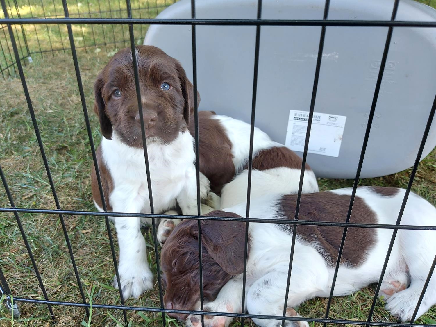 – næsten ligesom hvalpene, der nu er en måned gamle. På billedet her er de supertrætte efter at have leget vildt på græsplænen med hinanden og os .