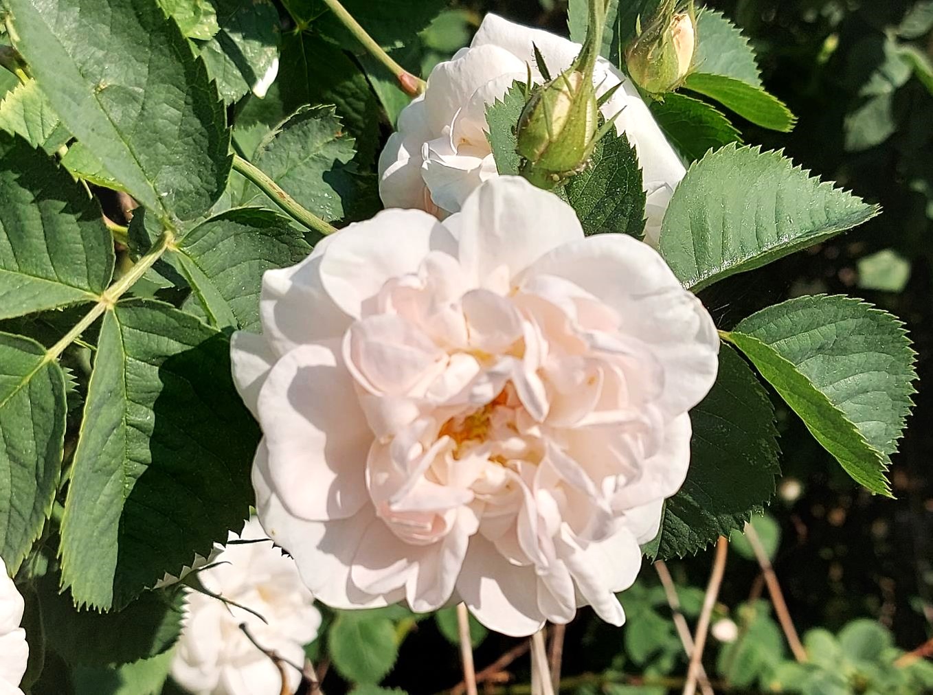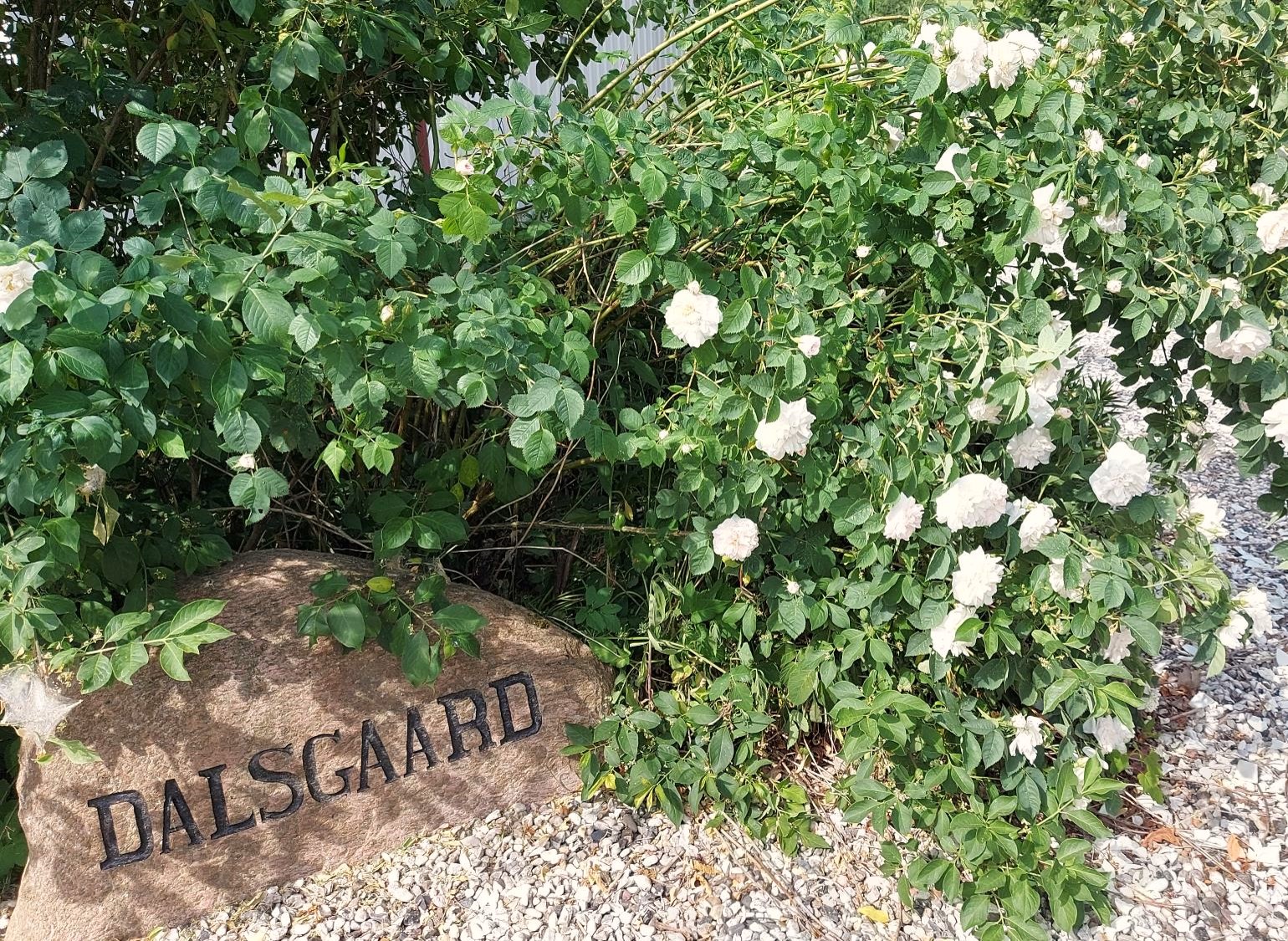 I bedet ved indkørslen står en rose. Den var noget af det første, vi plantede, da vi begyndte at anlægge haven, så næste år bliver den 20 år gammel. Det er en Alba rose, og jeg husker ikke længere navnet.