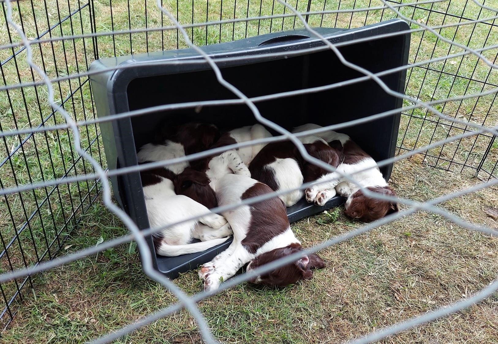 Vi er selvfølgelig hjemme i aften. Man er bare hjemme, når man kan have hvalpene ude i kravlegården til sent. De elsker at være der, og de har godt af at være ude. Det er så det gode ved det tørre vejr.