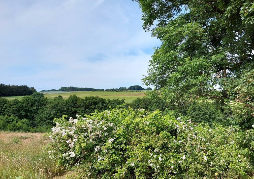 Men én rose har vi ikke vandet. Det er multiflora rosenhækken, den der senere vil give os tusinder af små hyben, Mariebær. Den rose er skabt til det vilde liv og klarer både tørke og regn uden at kny.