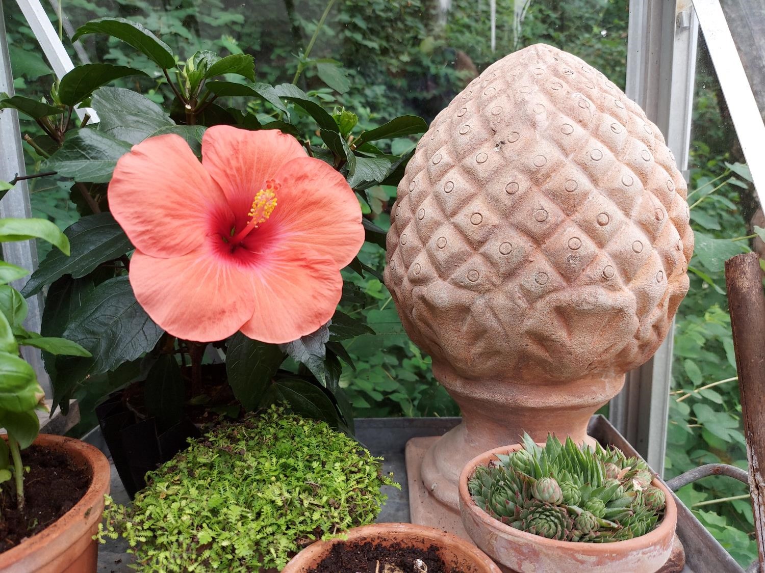 Ellers er det små, holdbare ting, der står der. Husløg, en lille trædebregne, der vokser ud over kanterne på sin lerpotte,